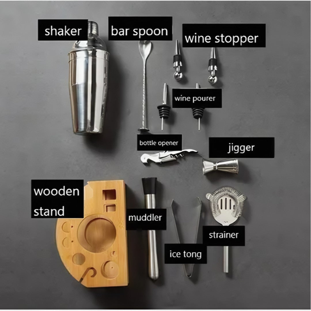 Set de Coctelería 12 Piezas Profesional con Base de Madera