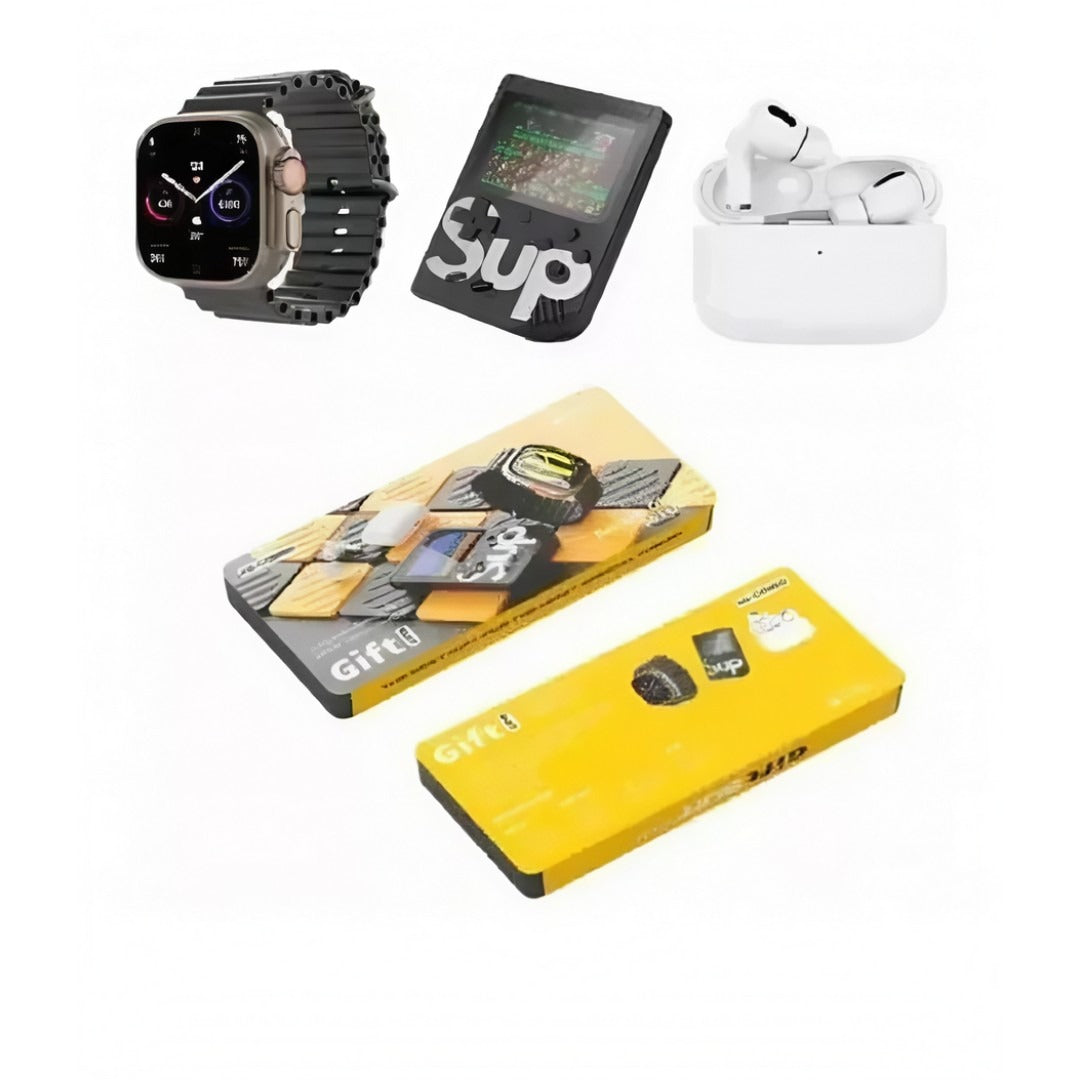 ✅ Smartwatch de última generación: Monitorea tu salud, recibe notificaciones y luce moderno en cualquier ocasión. ✅ Audífonos inalámbricos: Calidad de sonido envolvente, conexión rápida y estuche de carga compacto. 🎶 ✅ Mini consola retro SUP: Diversión asegurada con juegos clásicos para revivir momentos únicos en cualquier lugar. 🎮 ✅ Precio único: Ahorra dinero comprando todo en un solo paquete. ✅ Ideal para regalar: Un combo que sorprende a cualquiera con su presentación premium en caja. 🎁